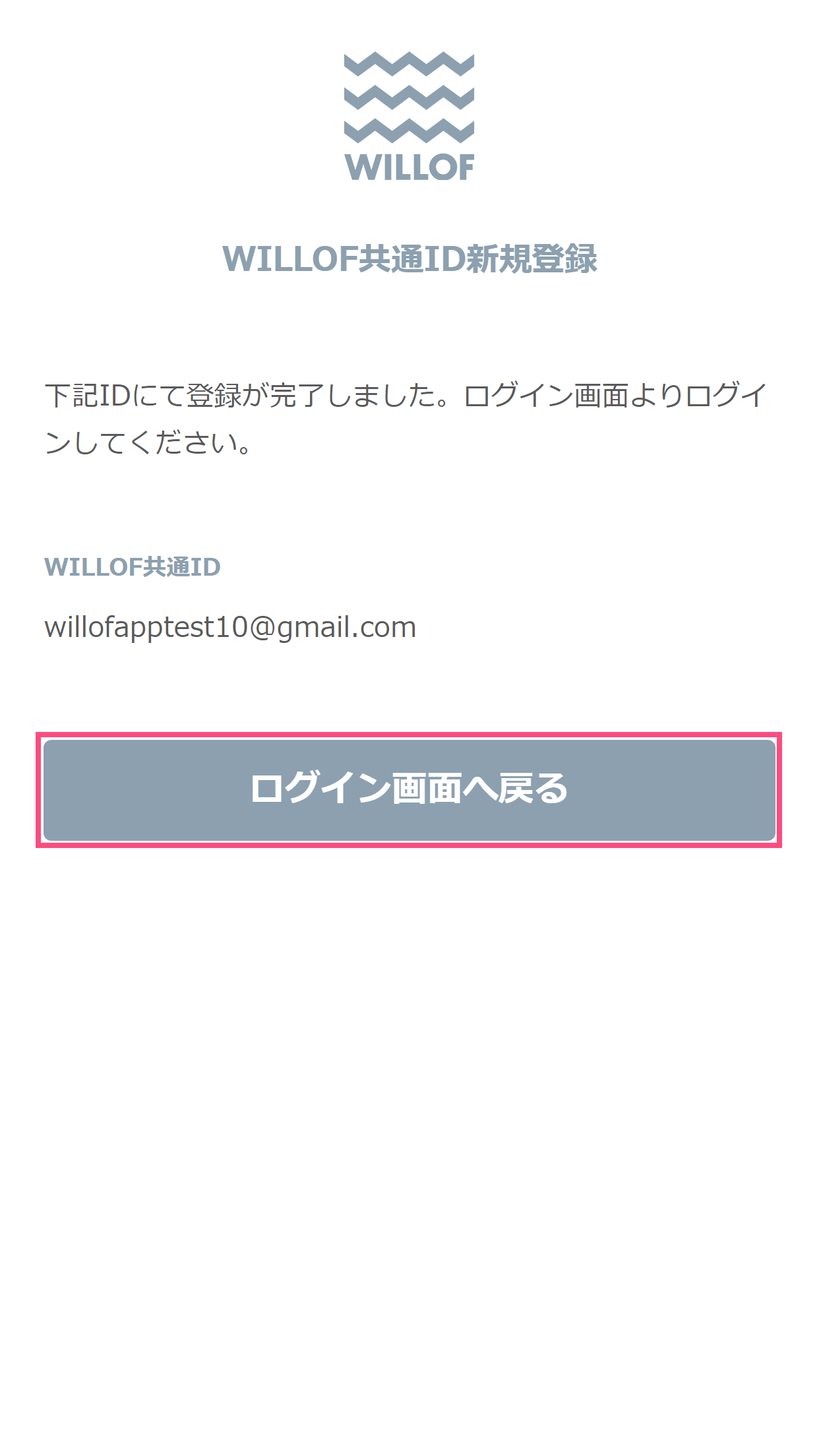 登録が完了しましたら以下の画面となりますので、「ログインへ戻る」を選択しログイン画面へ移動してください。